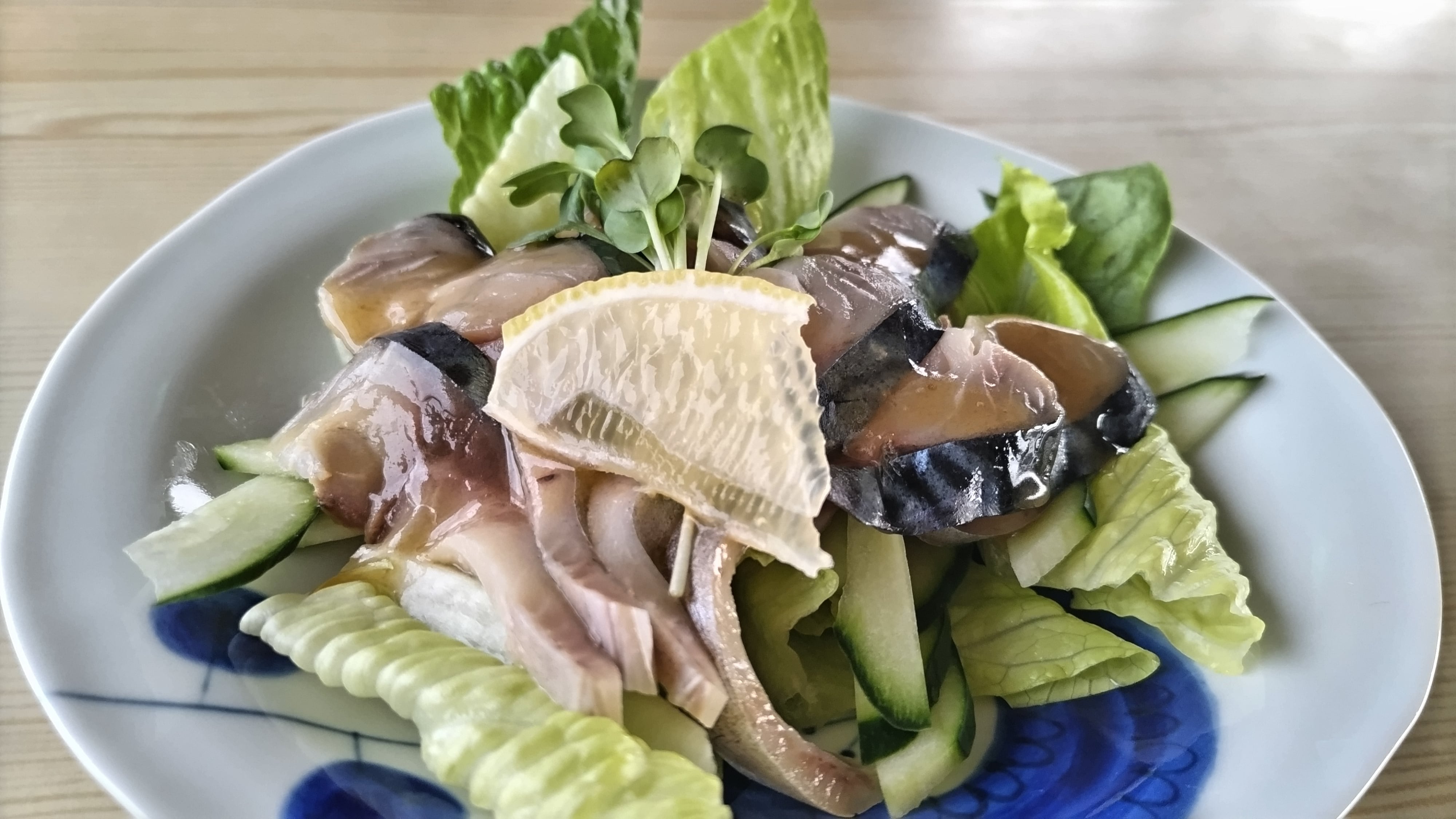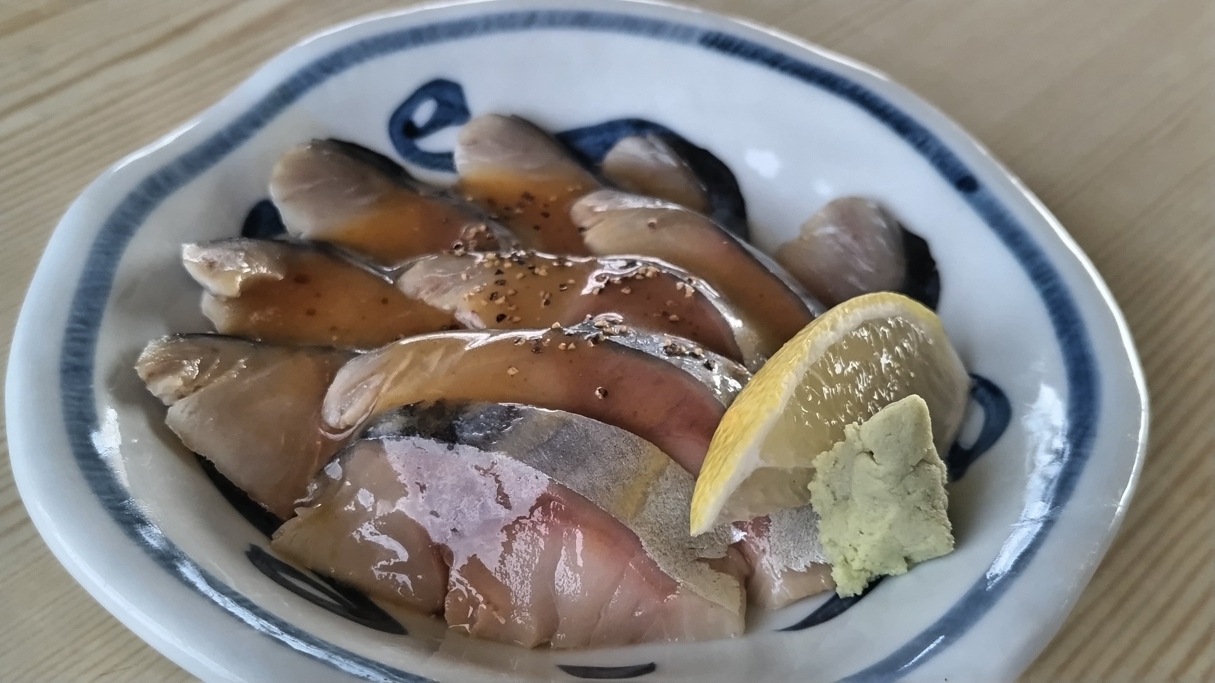 鯖のおなかについている脂から取れる「鯖オイル」をベースに作った、板長特製カルパッチョ用ドレッシングで、国産鯖を漬けました。